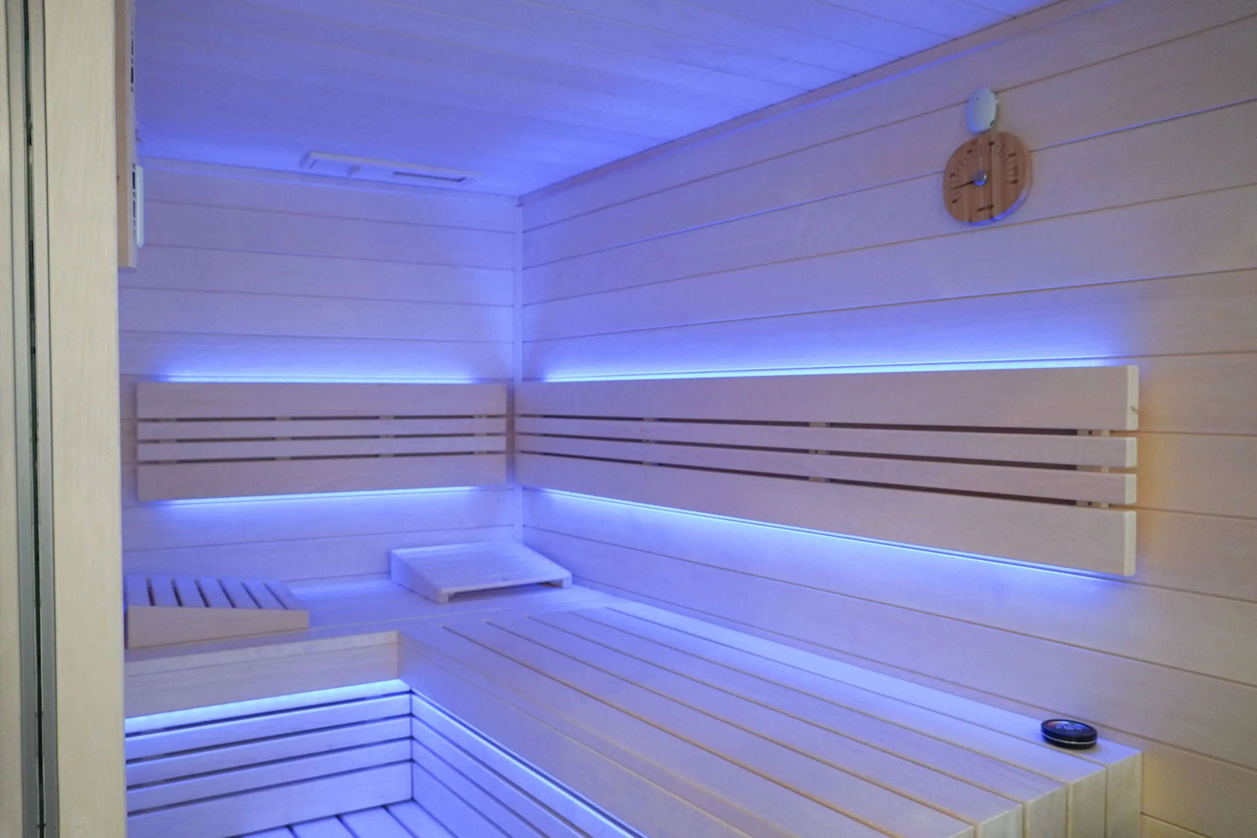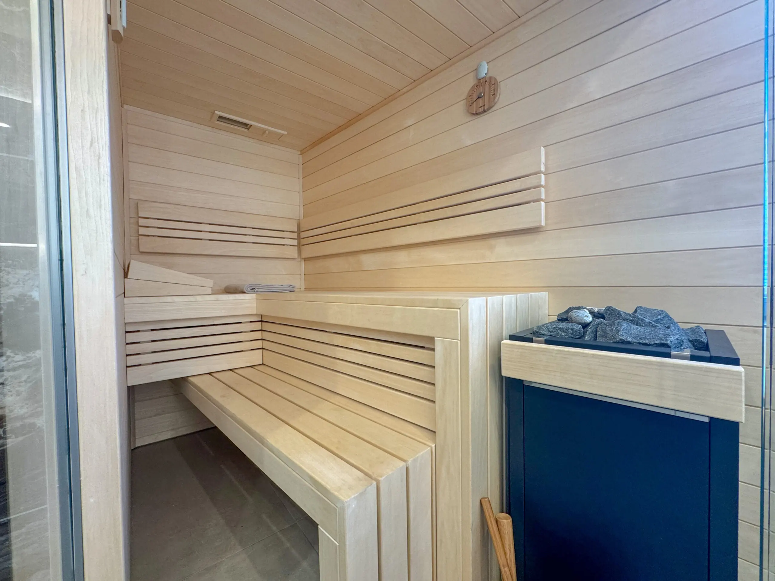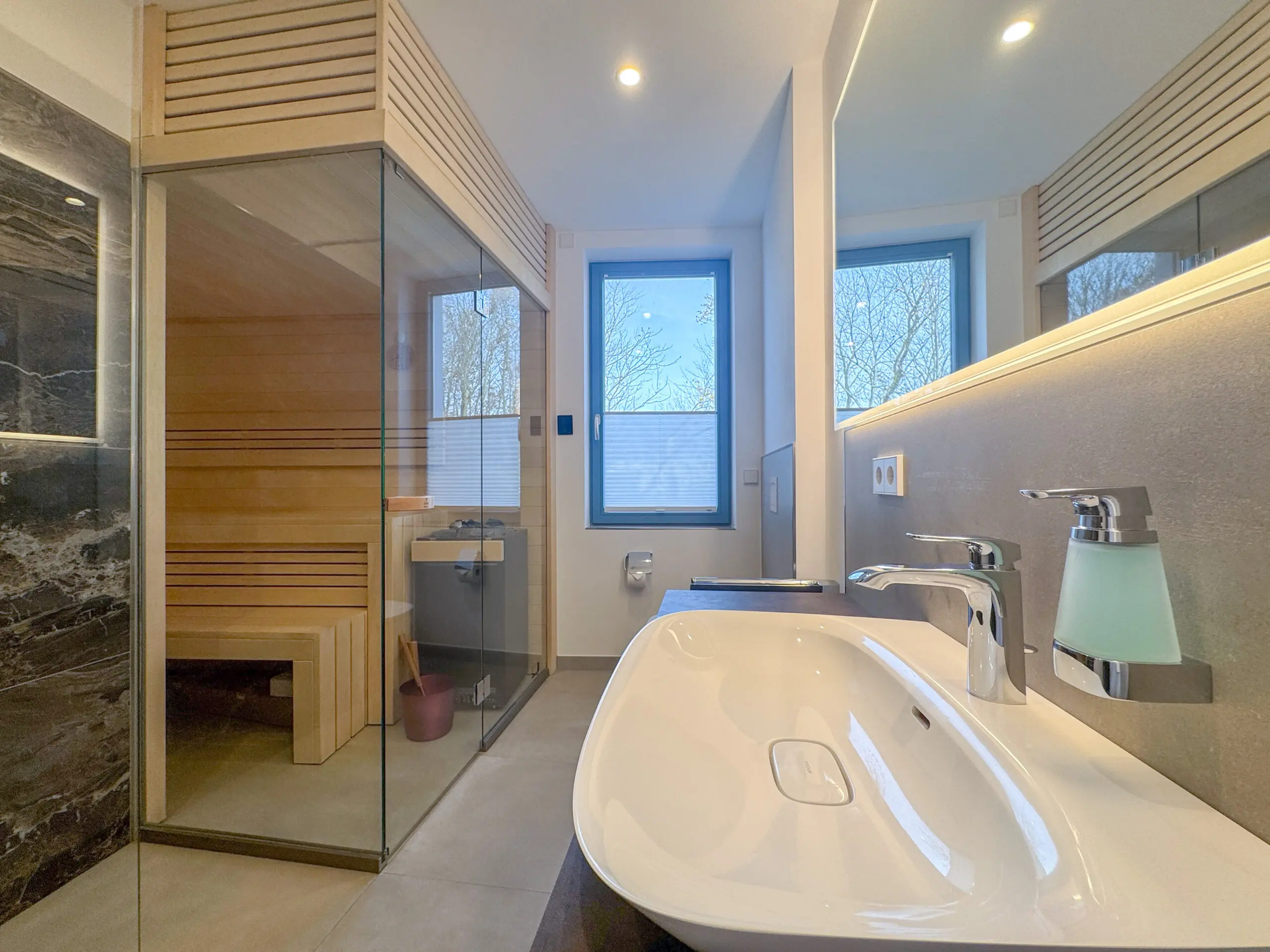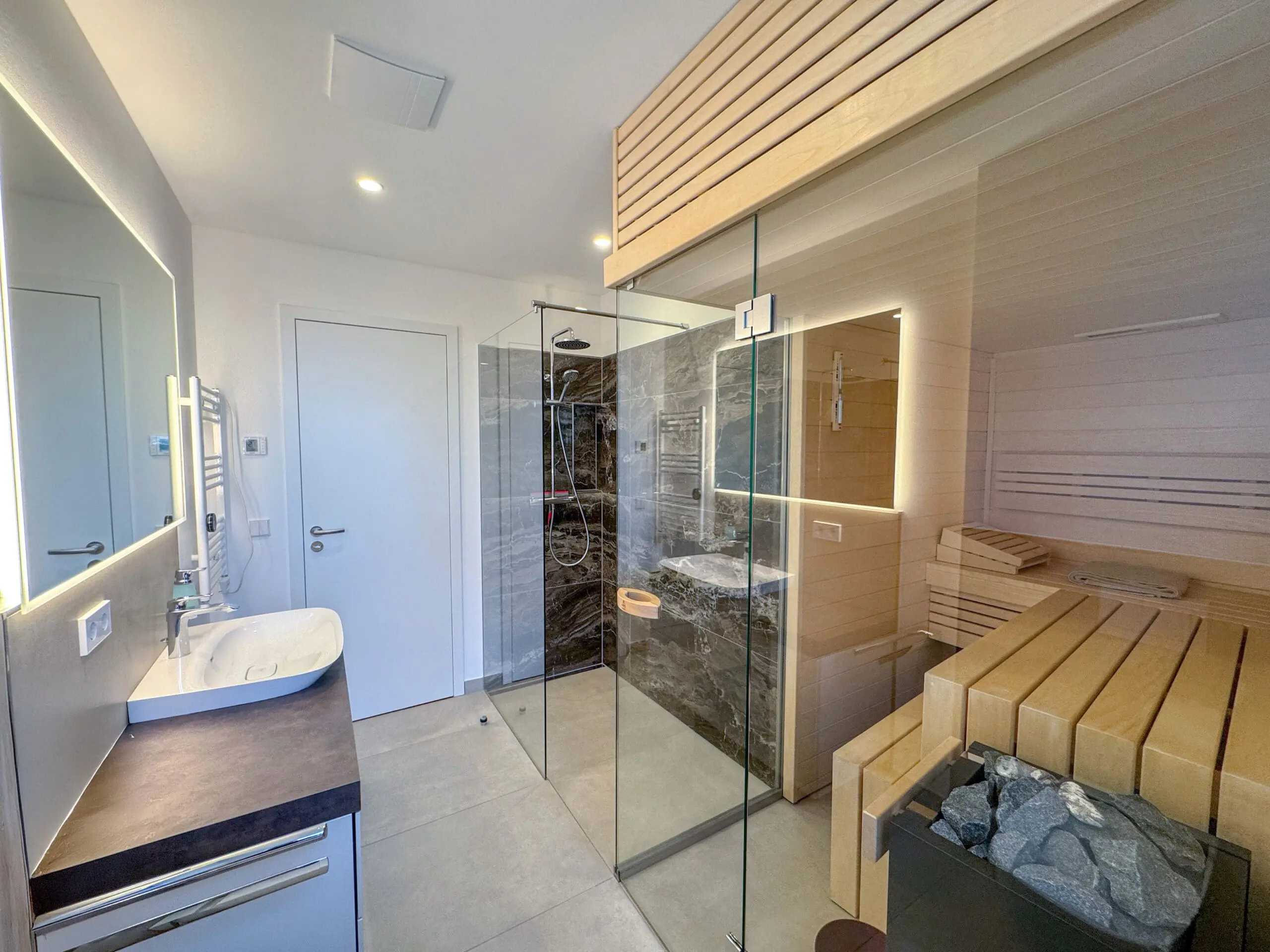 Zwei moderne Badezimmer stehen zur Verfügung: ein innenliegendes Bad mit Dusche sowie ein Tageslichtbad mit Dusche und eigener Sauna – ideal für entspannte Momente nach einem erlebnisreichen Tag.