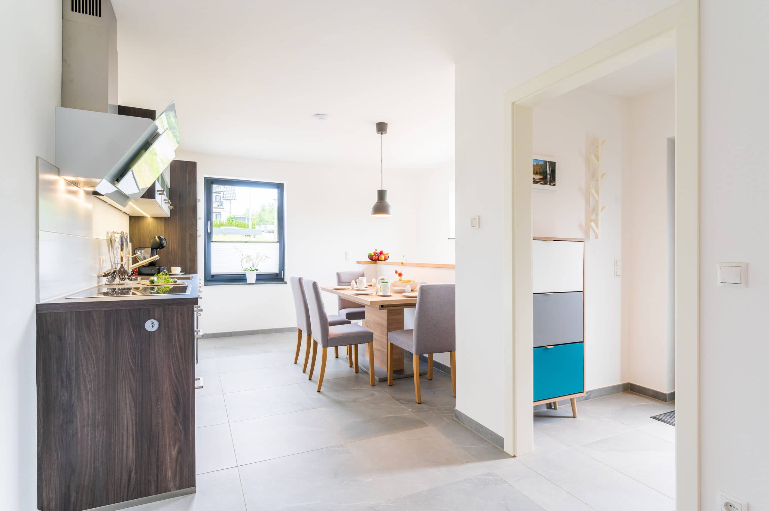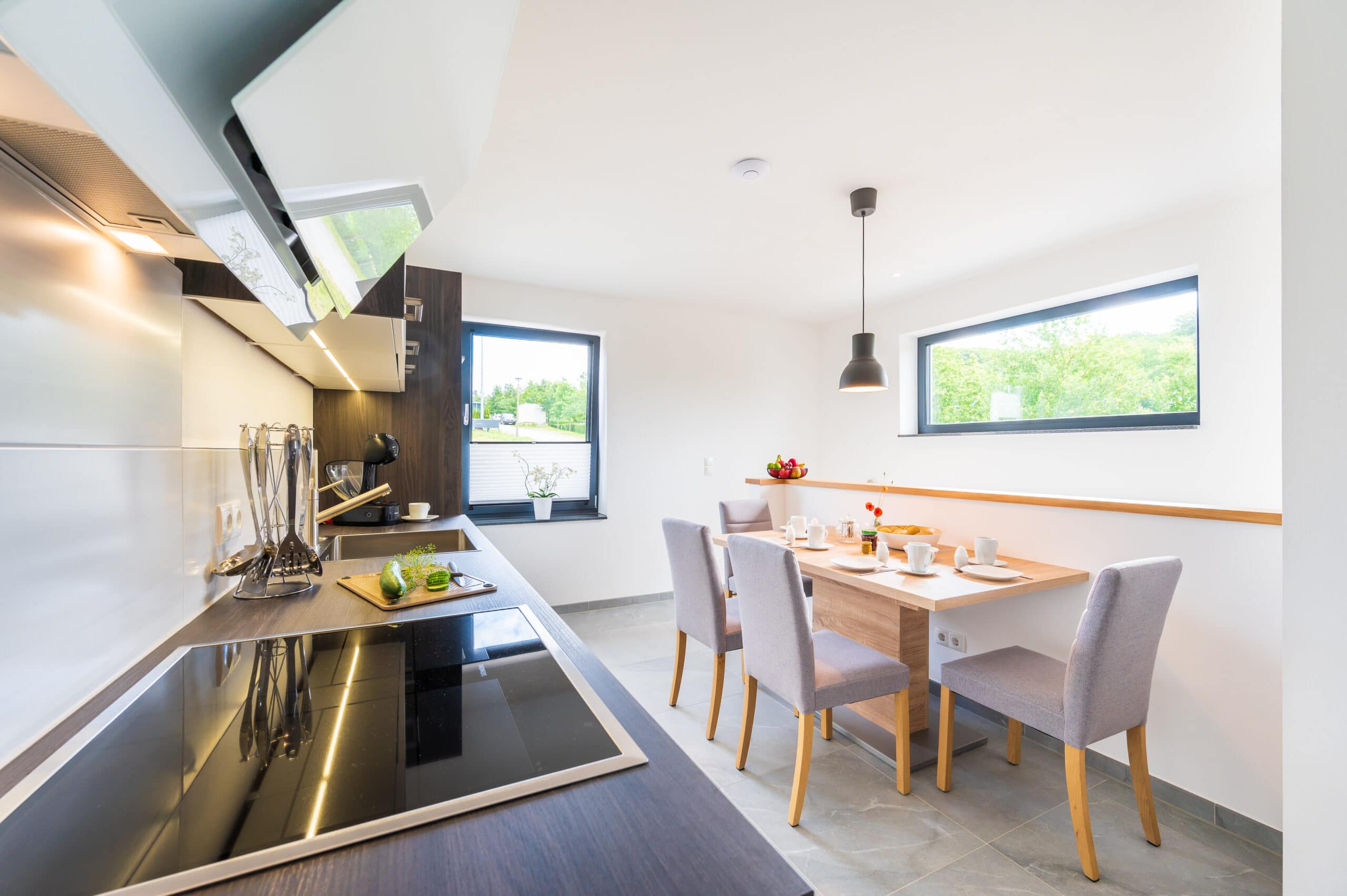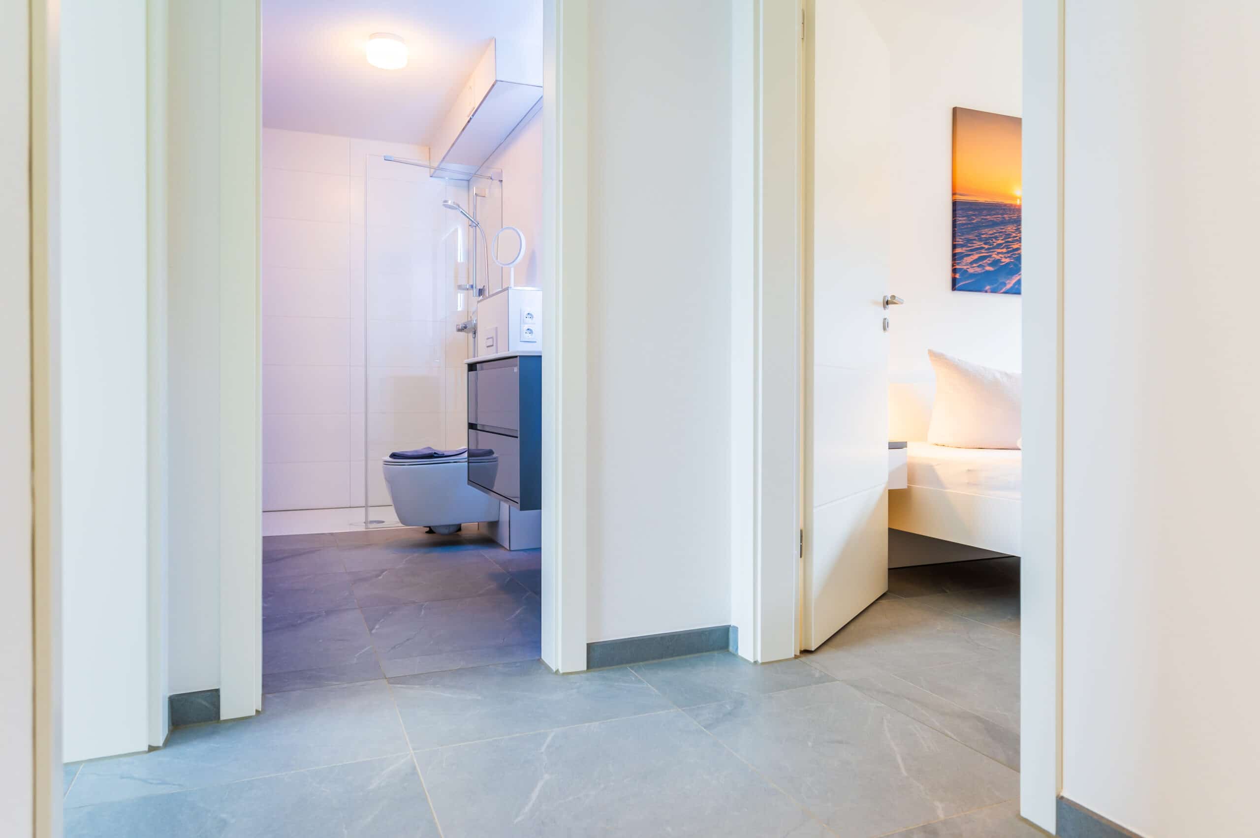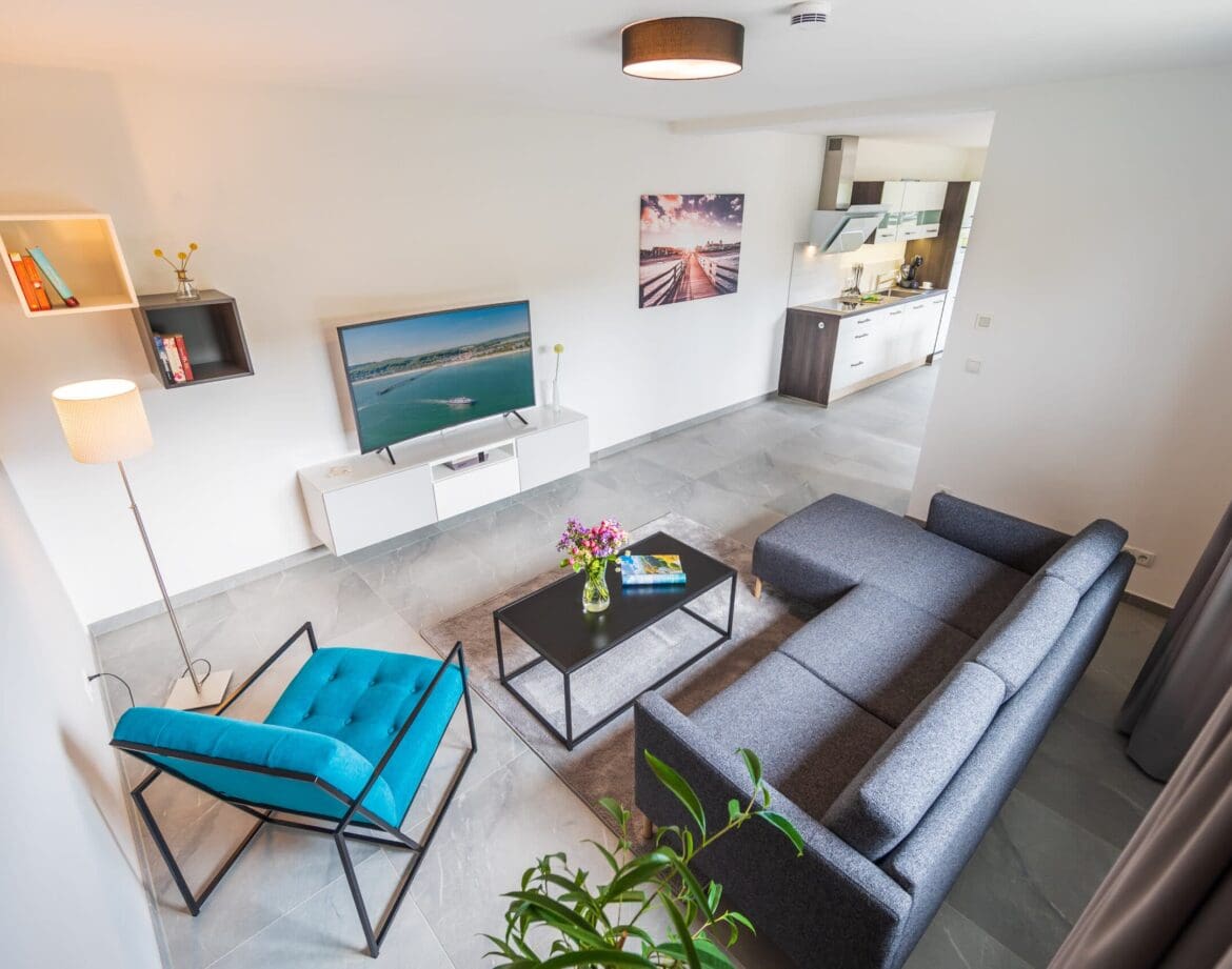 Die Wohnung erstreckt sich über zwei Etagen. In der oberen Etage ist der Wohnbereich mit offener Küche. Die Küche ist hochwertig ausgestattet mit Backofen, Induktionskochfeld, Mikrowelle, Geschirrspüler, Filterkaffeemaschine, Nescafé Dolce Gusto Kapselmaschine, Toaster und Wasserkocher. Im Erdgeschoss befinden sich die beiden Schlafzimmer (jeweils mit TV) sowie das Badezimmer mit Dusche. Vom großen Schlafzimmer gibt es einen Zugang zur Terrasse.